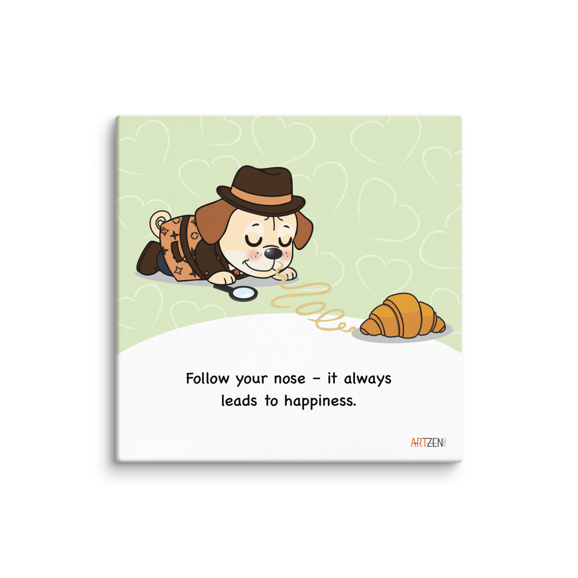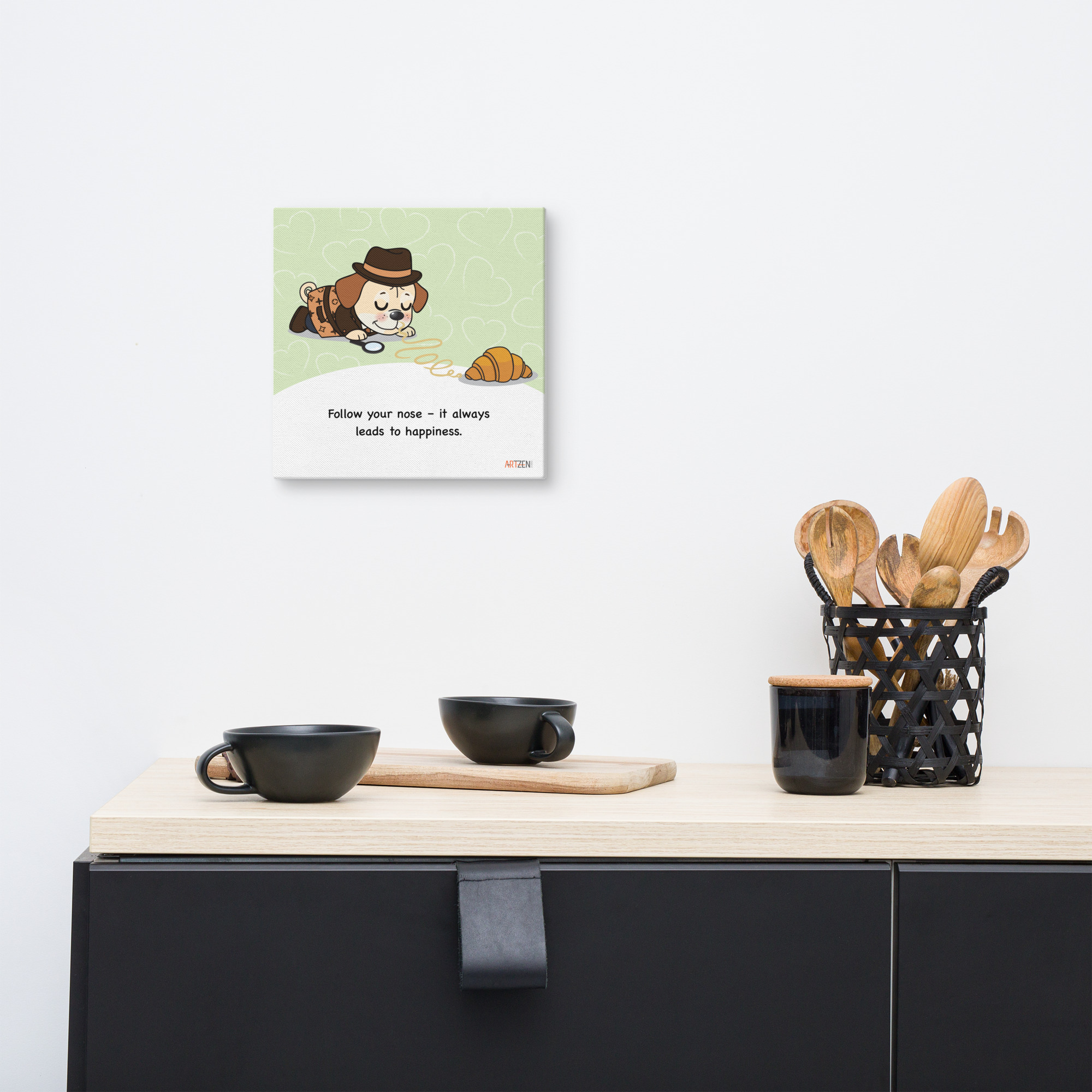 This playful canvas art captures Dukie mid-investigation, following the irresistible scent trail that leads straight to happiness (and a croissant).